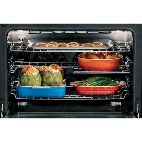 #42003 30" Double Wall Oven • Advanced analog temperature gauges • Premium cast handle • Premium knob controls • Gourmet package of accessories includes a roasting rack and searing grill Variable speed true convection oven delivers consistent temperatures to cook food evenly ... Read More